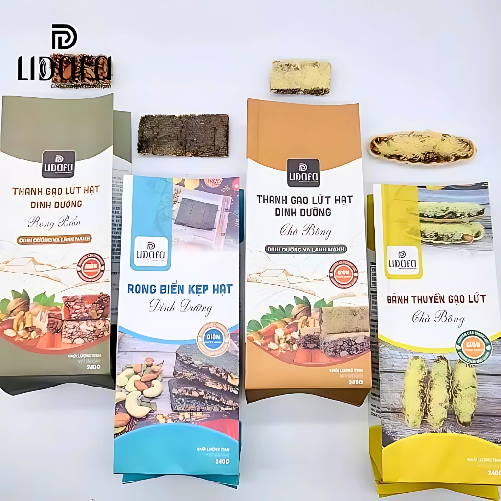 Combo bánh healthy mix 02 gồm có: Thanh gạo lứt chà bông LIDAFA + Thanh gạo lứt rong biển LIDAFA + Rong biển kẹp hạt dinh dưỡng LIDAFA + Bánh thuyền gạo lứt chà bông LIDAFA